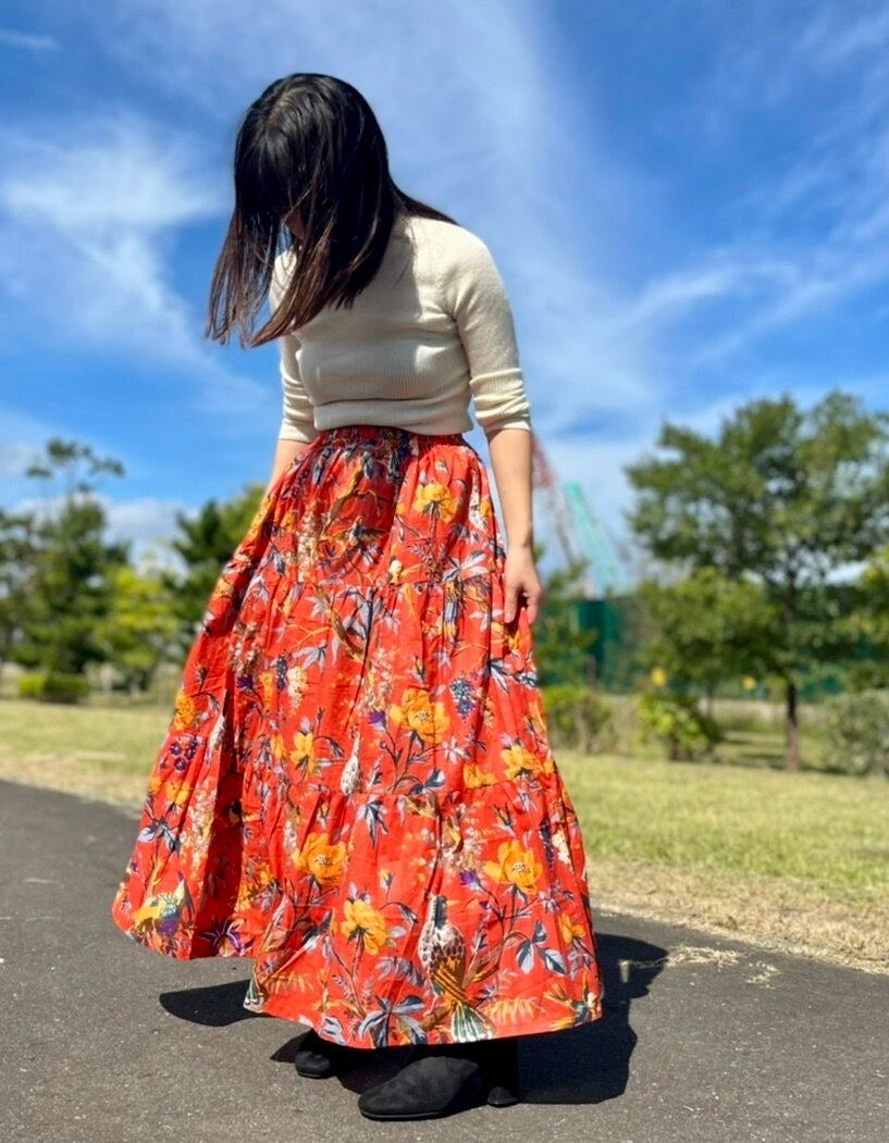 鮮やかなオレンジレッドカラーが華やかなスカート。